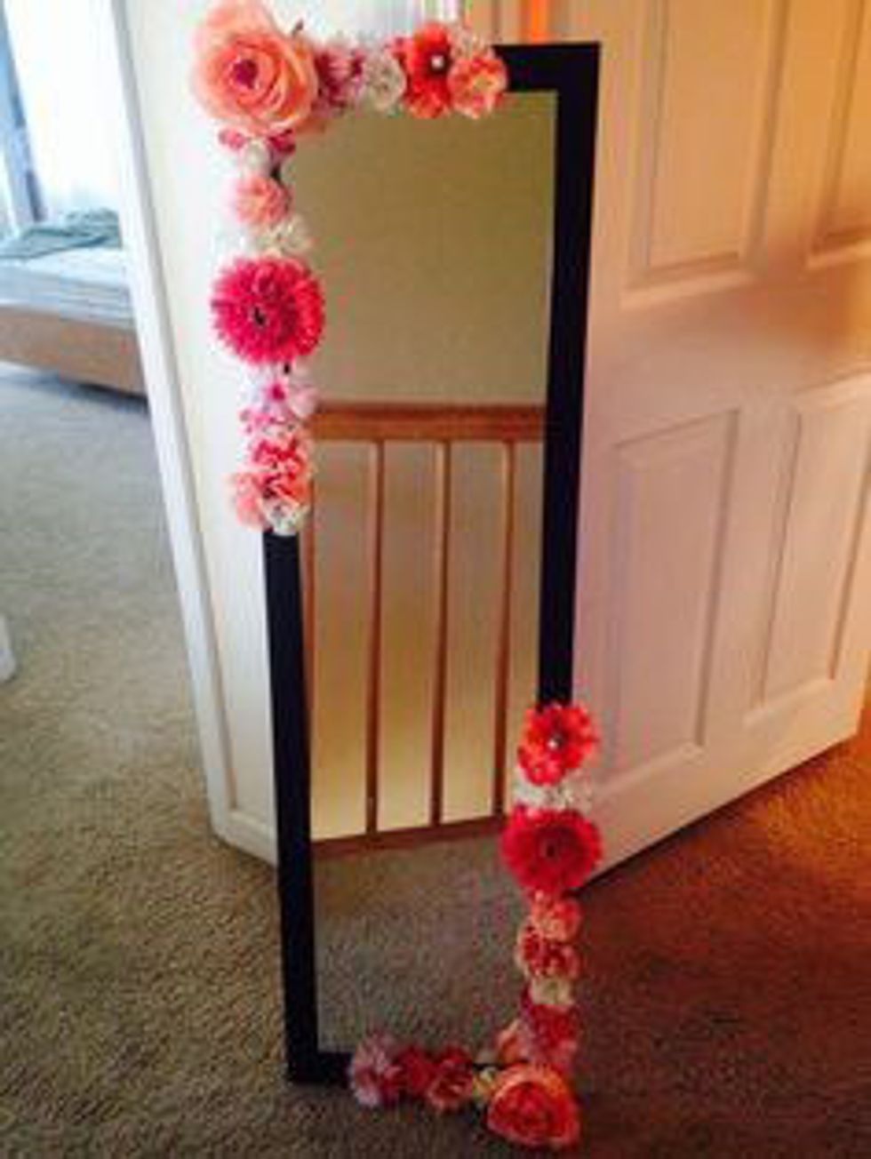 2. Deck out your ten dollar mirror from Walmart/Target with flowers and hot glue.