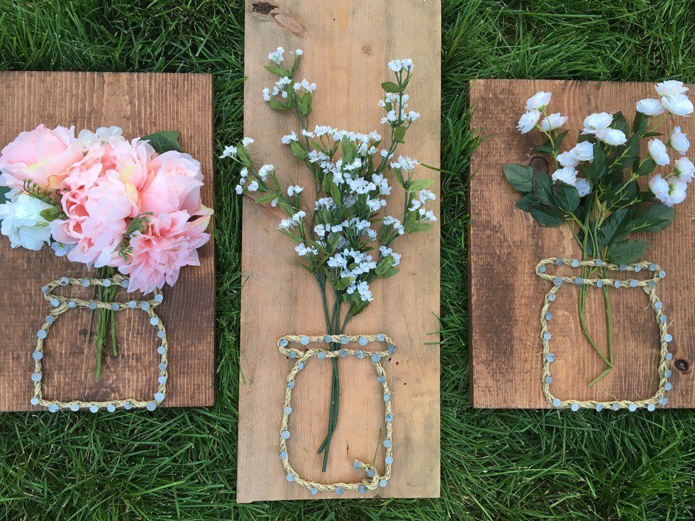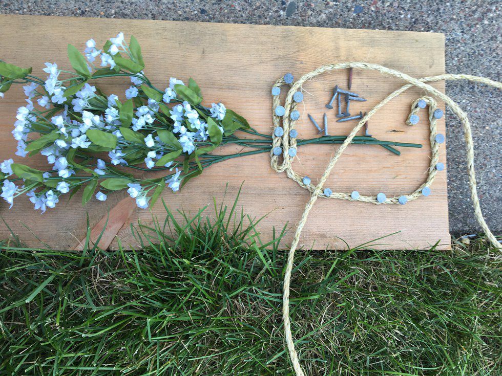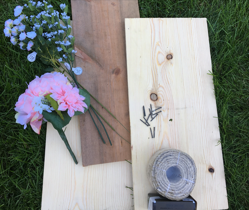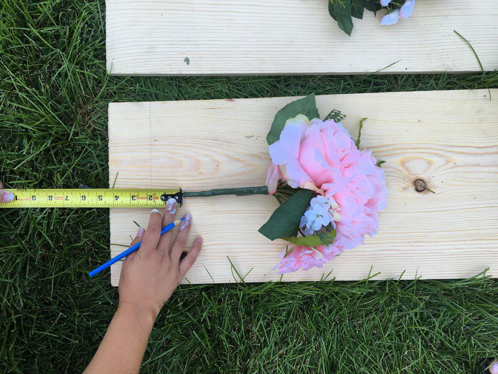 Put the flowers where you want them on the board, measure it out and then cut the wood. Make sure that there is enough room for you to make a vase with the twine around the stems.
