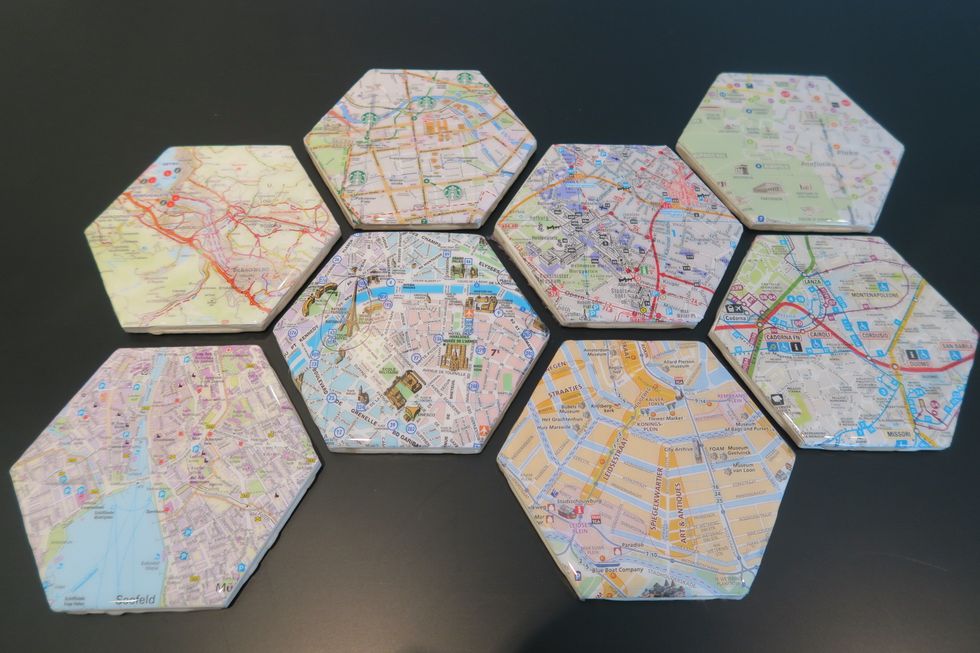 I've made this project many times for gifting and selling and they are always a hit. I start by cutting the maps to fit the coaster, then I glue the map pieces to the tiles and cover each completely with decoupage glue to seal it. I then pour a two-part resin (which you can purchase here) completely over the coasters. After a few days, they are set and dry. I put felt stickers on the bottom (so the tiles don't scratch the coffee table) and then they are ready for wrapping!