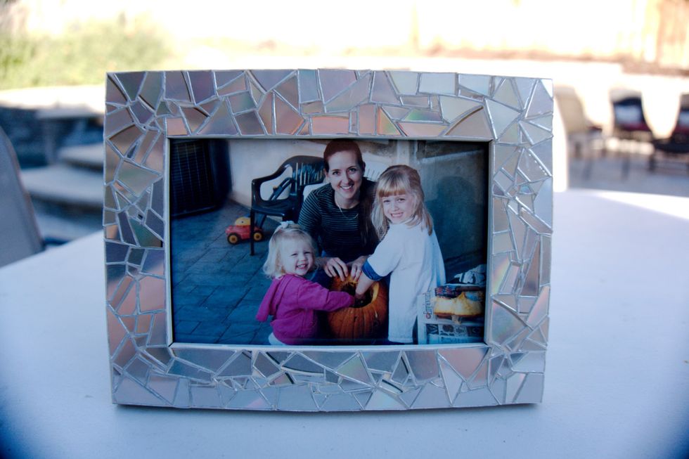 I made this for my mom's birthday one year and she loved it. It's a simple project that costs little to make. I found an inexpensive picture frame at the thrift store and painted it to look new. Then I found some old CDs and cut them into random small shapes (thank you, Spotify, for making the destruction of my CD's something I would actually do). Then I glued the pieces onto the frame mirror-side up. It took some time, but the end result was a lovely gift that anyone would appreciate.