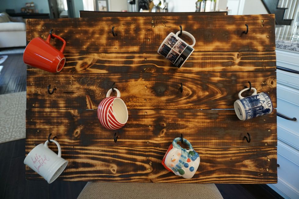 I found my pallet next to a dumpster at my university and stripped off the unnecessary wood. I then sanded it down and used a blowtorch to seal the wood and give it some color. You can paint, stain, or varnish your pallet depending on the look you want. I then measured where I wanted each mug hook to go and screwed them in by hand.