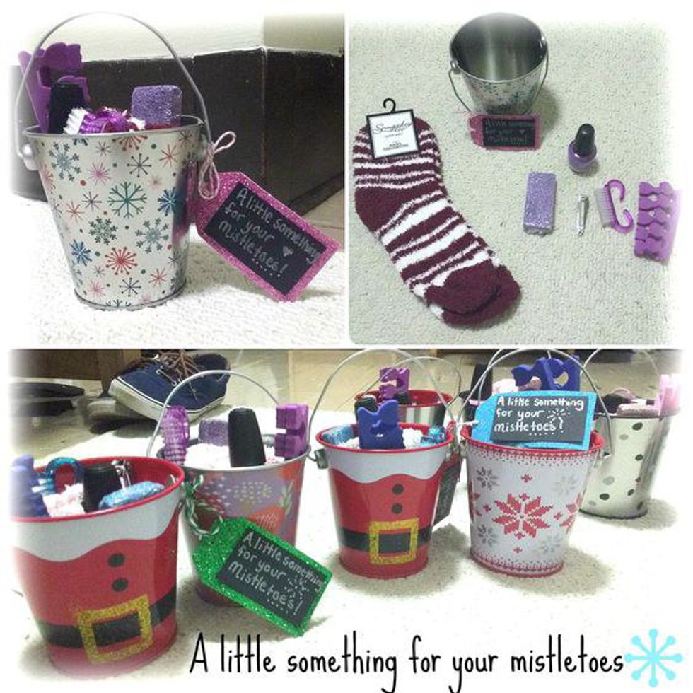 This is another great gift for co-workers. I found these cute pails from the dollar spot at Target and filled it with fuzzy socks, nail polish, and a pedicure set that I found at the dollar store. I added cute gift tags that I also found at the dollar spot at Target and wrote: "A little something for your mistletoes"...Get it?