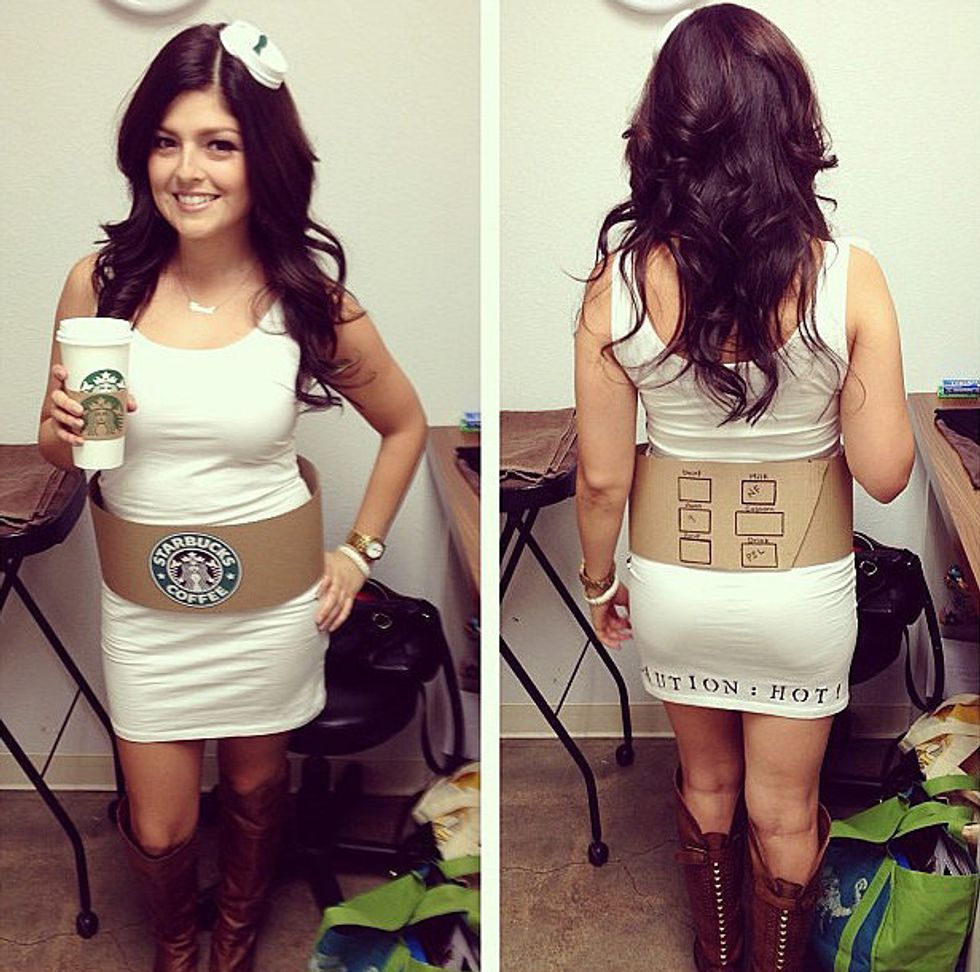 Pretty easy looking, right? Buy a white base, whether it be a dress, skirt/shirt combo, shirt/pants, whatever...Then get some light weight cardboard and paste the Starbucks logo on the front. Get all the details right buy buying yourself a nice cup and copying every detail!