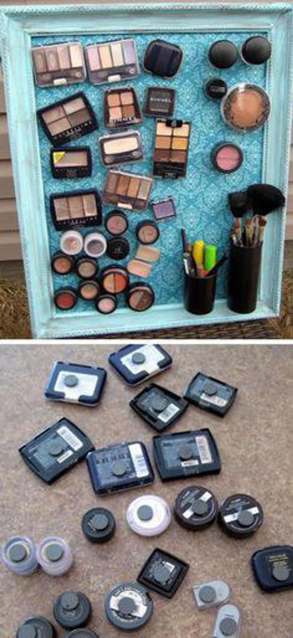This magnetic frame is a great way to organize and store your smaller makeup items. To make this, all you need to do is choose a frame, wrap the back piece with some decorative paper, then buy and stick on mini magnets (such as the ones in the bottom picture) onto your makeup products and the board itself (before covering it in paper).
