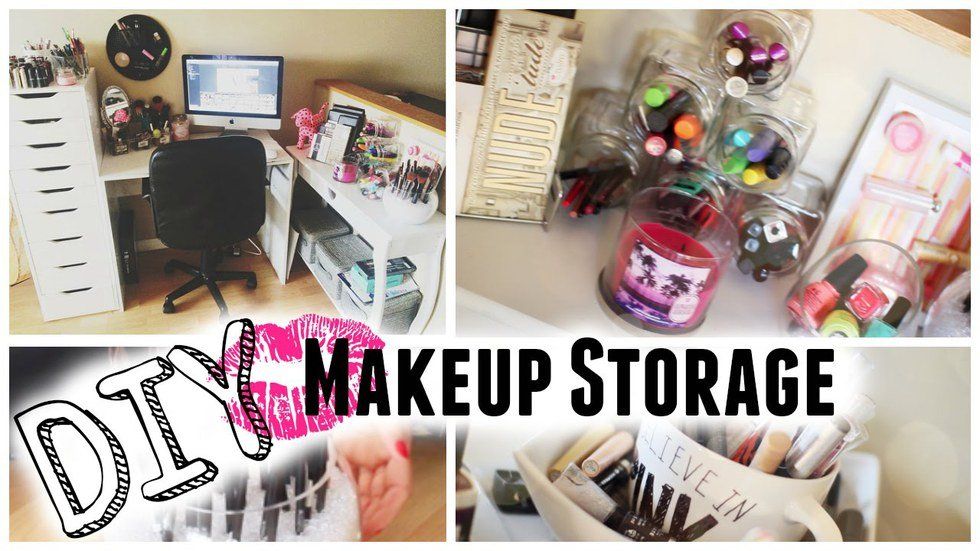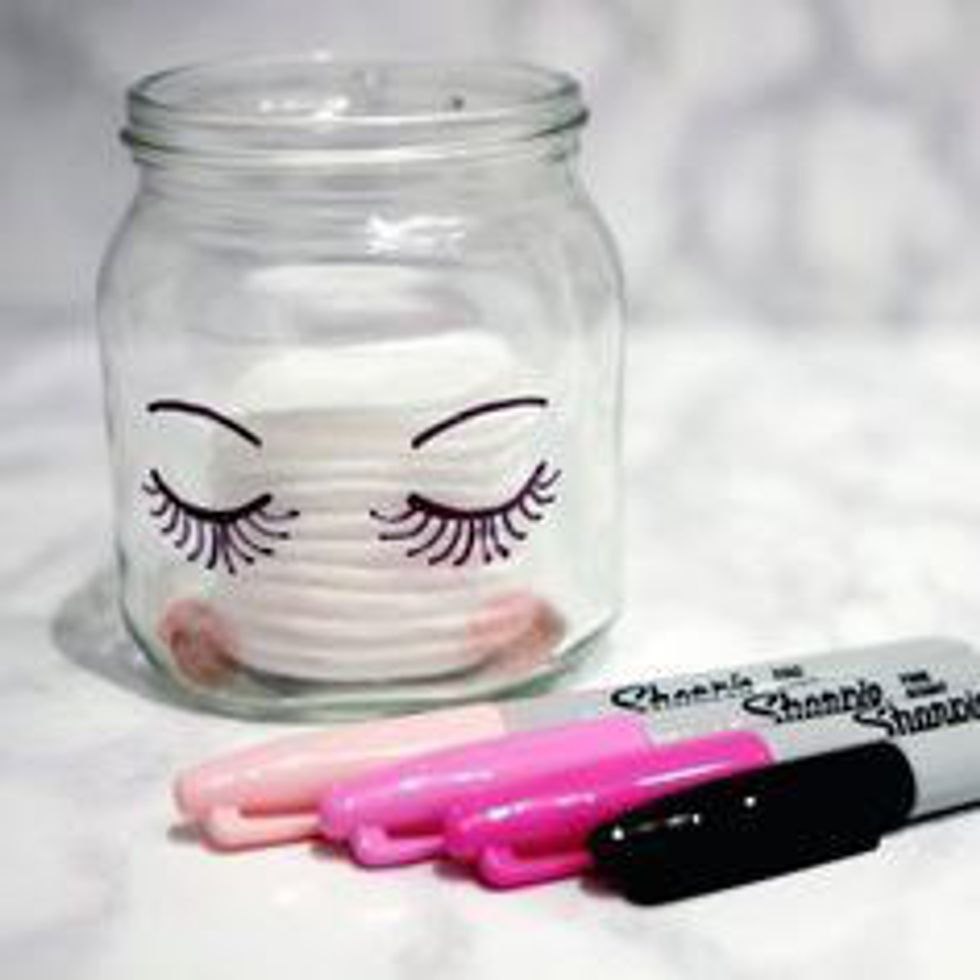 Mason jars are a classic way to organize just about anything you can think of. One way to use them to organize your makeup is to buy whatever size you'd like and use sharpies to decorate them. You can even draw little faces on them like the one pictured above. This DIY won't cost you more than a few dollars per mason jar.