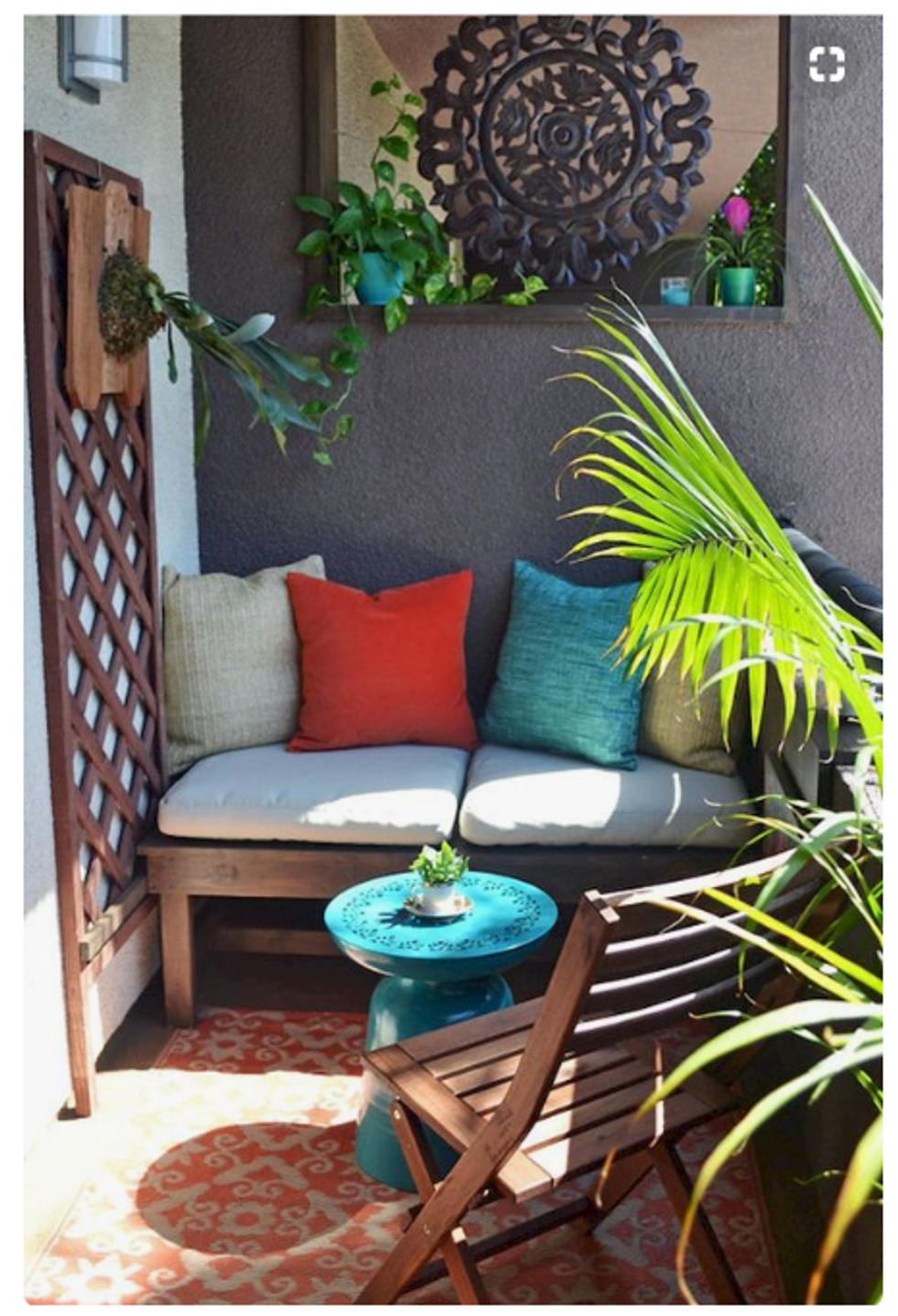 It's a well-known design hack that adding a mirror to a room will make it feel bigger. Bright colors do that, too! They liven up any space, especially a patio. Splash your balcony with color by growing bright flowers or laying out a rug with a multicolored design.