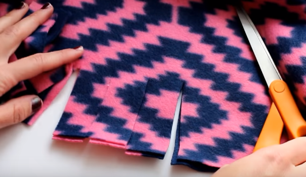 Have you ever done a "no sew" fleece project before? Then this step is a piece of cake! Make inch long cuts no more than 1/2 inch wide.