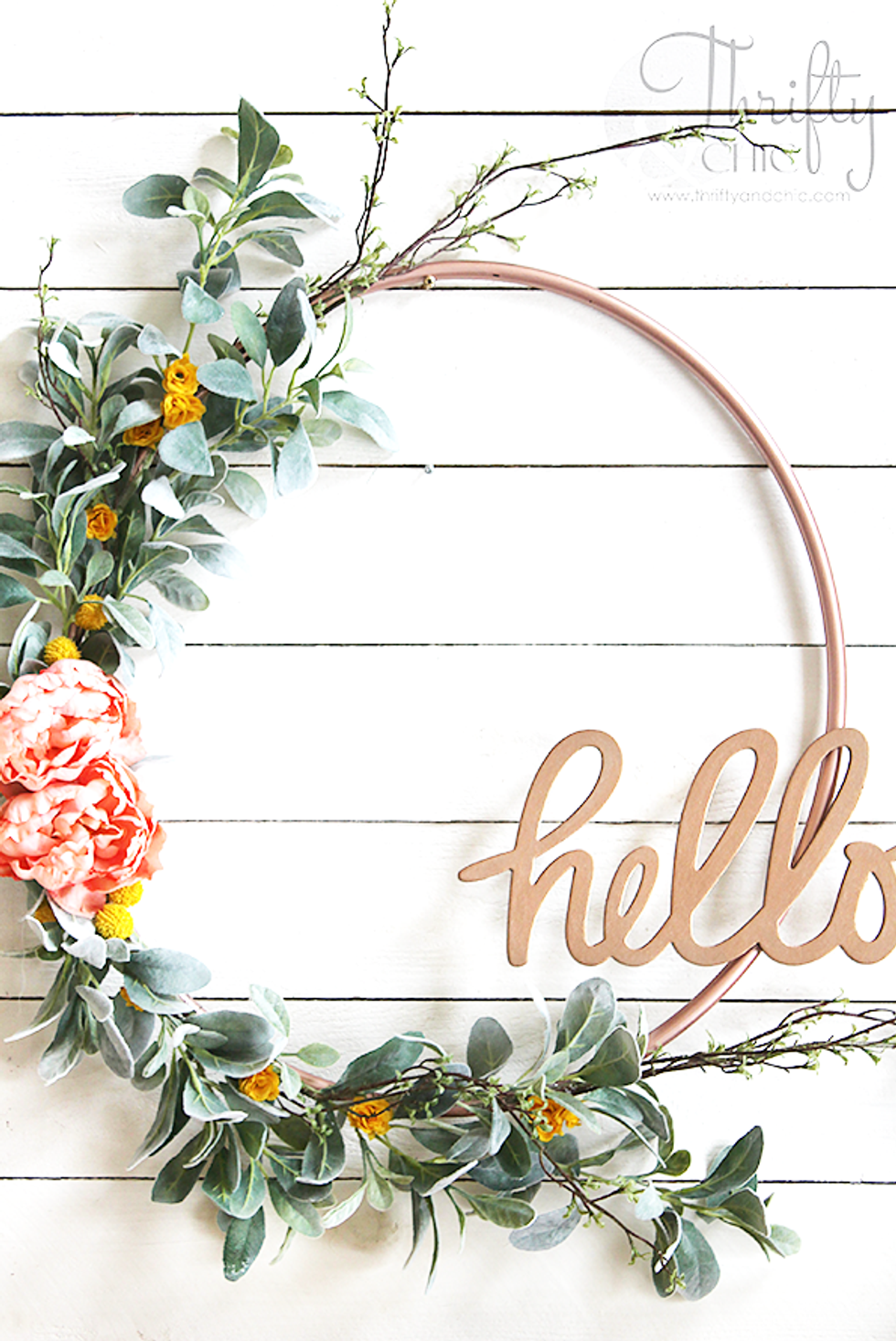 Who knew a hula hoop could make such a great floral wreath? The trendy rose gold mixed with the simple faux florals make this a great piece to welcome guests or to hang almost anywhere on your wall.2. Rustic mason jar sconce.