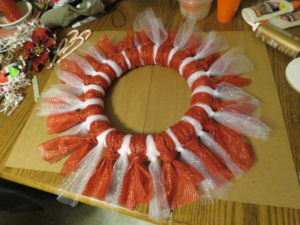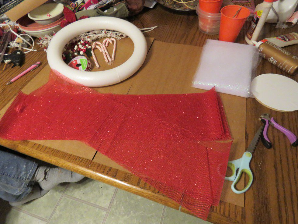 Continue adding your tulle around the Styrofoam ring until every possible inch is covered. It will take a while so be patient. Also, it might be a good idea to have a helper so they can hold the ring while you make the lark's head knots over and over and over and over and over again. Also be careful because as you are pulling the tulle through the loop it is possible to sustain some slight injuries in the form of scratches. It happened to me while I was making this wreath. It stung like a paper cut, but you'll survive. Trust me.