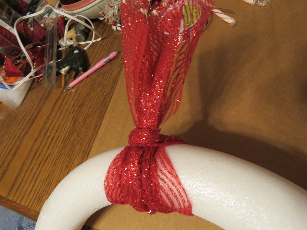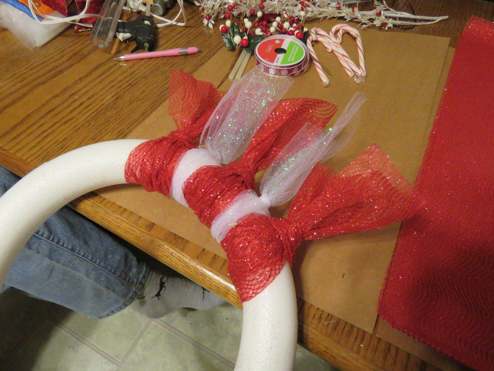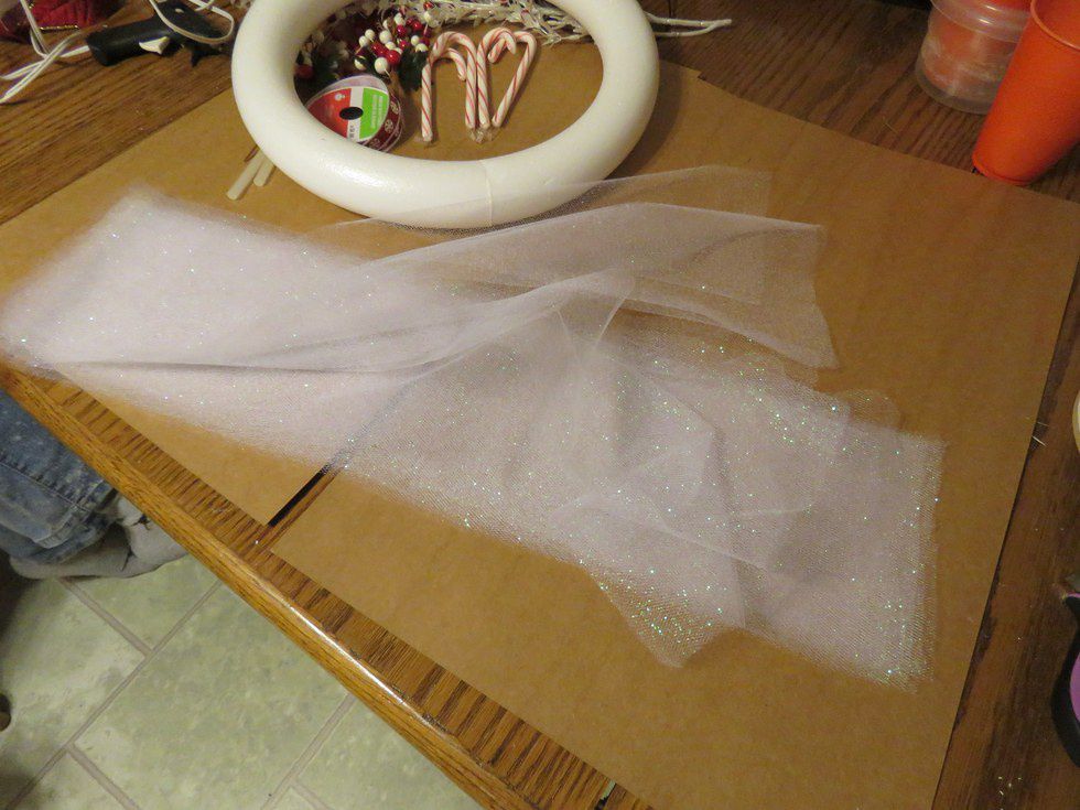 Add the tulle on by folding it in half lengthwise then widthwise. Place the Styrofoam ring in the middle of your tulle strip and draw the loose ends of the tulle through the loop on the other end of the tulle. It's really easy and if you don't know what I'm talking about, look up a lark's head knot. That's what it's called. I Googled it.
