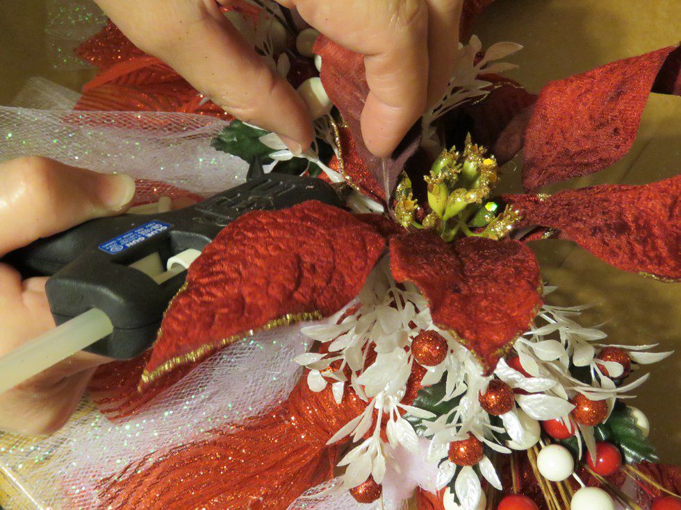 Now that you are well-rested and fed, you can return to making your wreath. Arrange the fake flowers and your decorations on the wreath before you begin hot gluing them on. Pre-arranging them will give you a better idea how you want the final wreath to look and it might save you some hassle later if you don't like the placement of a flower or two or all of them. Once you are satisfied, start gluing them on with your hot glue gun. Just be careful not to burn yourself or accidentally burn your helper. Hot glue is very hot and it hurts when the metal tip of the gun touches your skin. If you did burn yourself, put the gun down and run the burned area under some cold water for several minutes. Again, your masterpiece will stay right where it is. You are adding on fake flowers, not functional limbs. It will not get up and walk away.