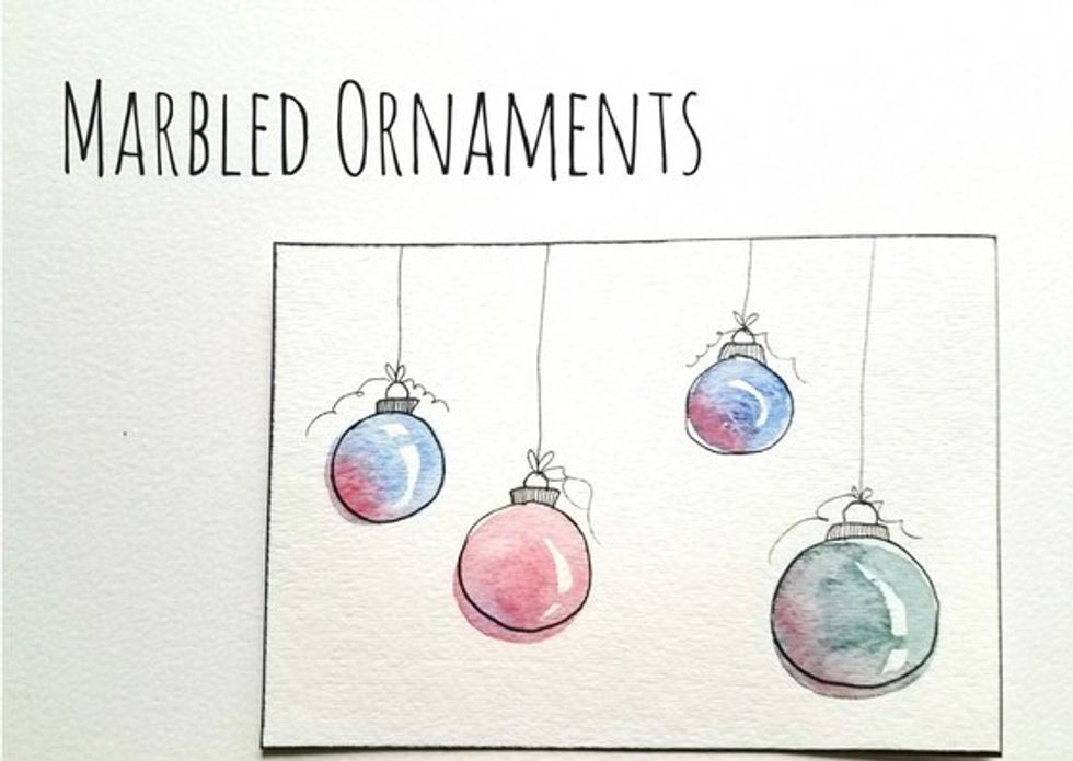 While still wet, dip another color along the side and watch the color spread! Alternate colors and use contrasting colors for vibrant results. Once dry, outline the ornaments and add hooks on the tops using a black pen. Allow them to hang freely or draw a branch for them to hold on to.