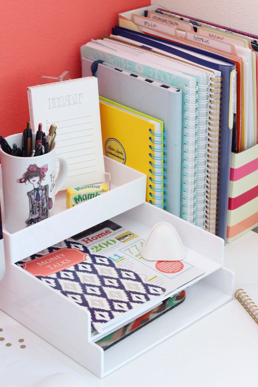 I don't have a desk in my room, so everything from school, work, and basically anything else ends up on my dresser. This fall, I decided to be proactive and buy a couple desk organizers and I also bought a few stackable trays. For the organizers, I put my medication, sunglasses that I don't use, pens/pencils, little candies like Jolly Ranchers, and it's also where I put my bracelets and rings before I go to bed. Basically, the possibilities are endless with those organizers. As for the stackable trays, I use one of them for my class binders and switch them out every day for the ones I need, and the other one, I use for the binders of my various student organizations and class books. It's probably the best thing I've ever done for myself in terms of keeping myself sane and organized this semester.