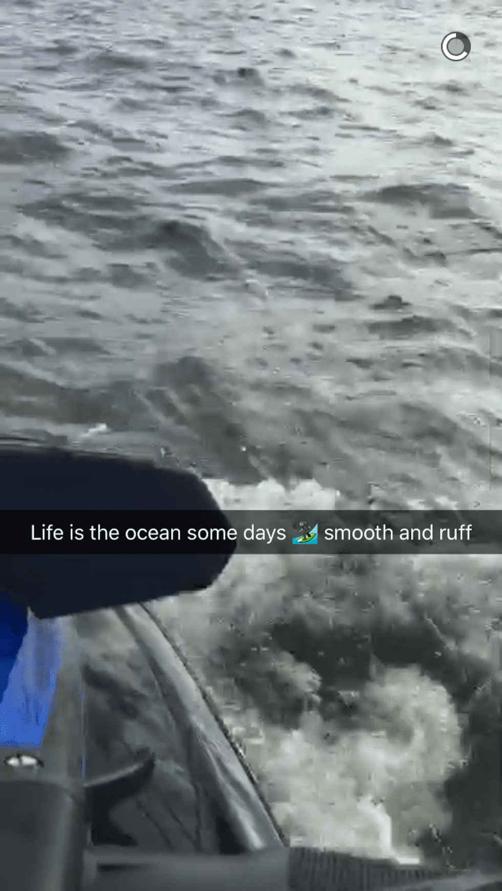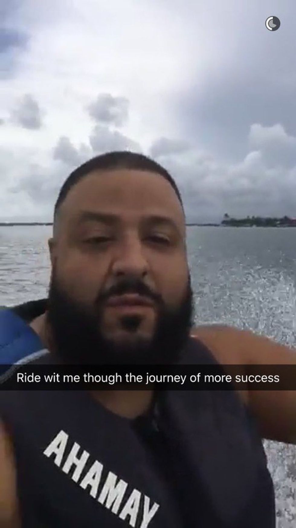 One things Khaled loves to do is ride his blue jet ski. He snapchats while riding and I'm not sure how safe this is, but he's still inspirational.