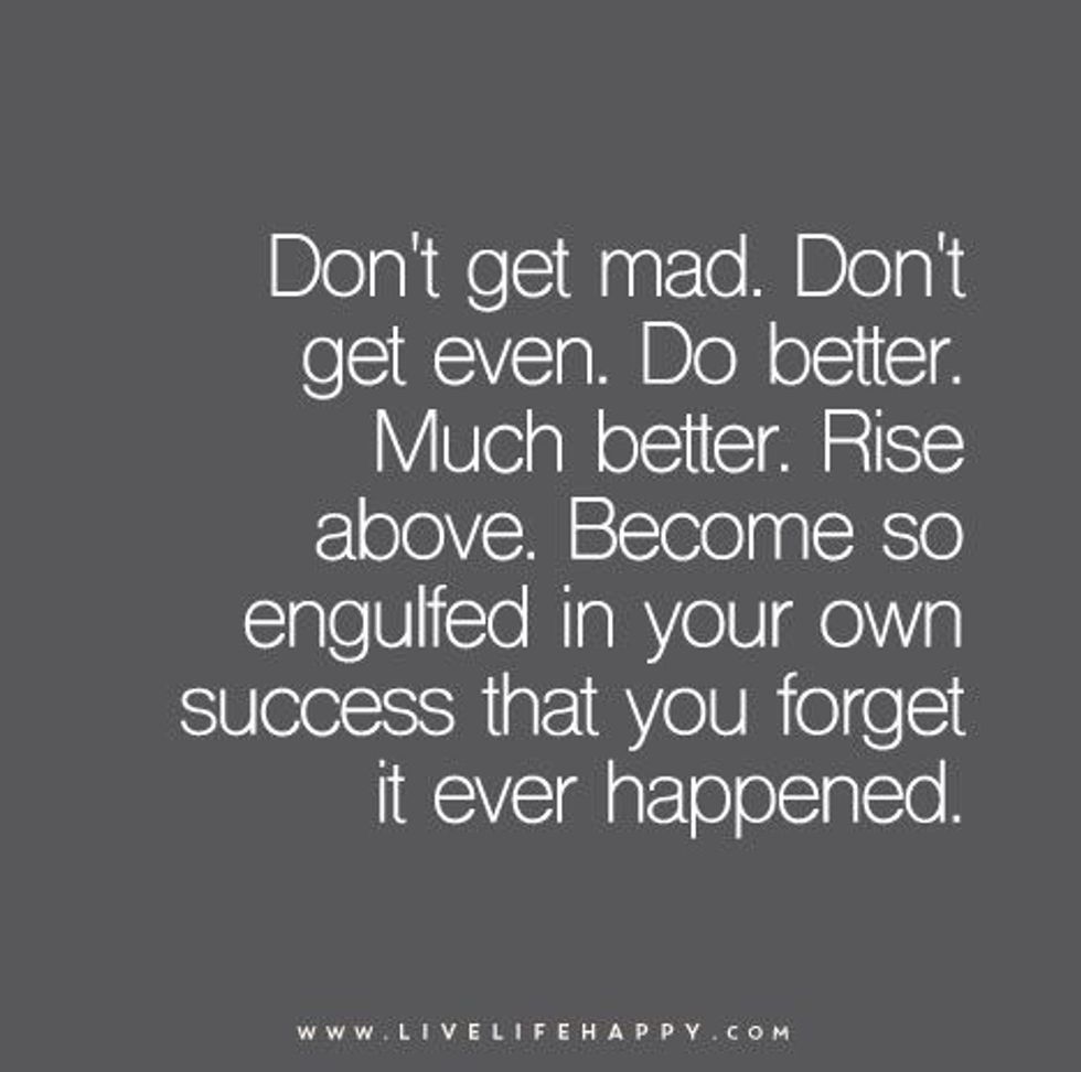 Don't get mad, or sink to their level. Don't get even. Don't let them be the reason why your blood is boiling. Don't waste another thought, word, or breath on negative energy that will not help you grow. Rise above; leave that conflict in the rear view mirror.