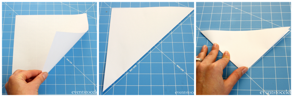Fold each square diagonally from bottom right corner to top left corner to create a triangle. Fold corners again to make a smaller triangle. Repeat with each of the 5 remaining pieces.