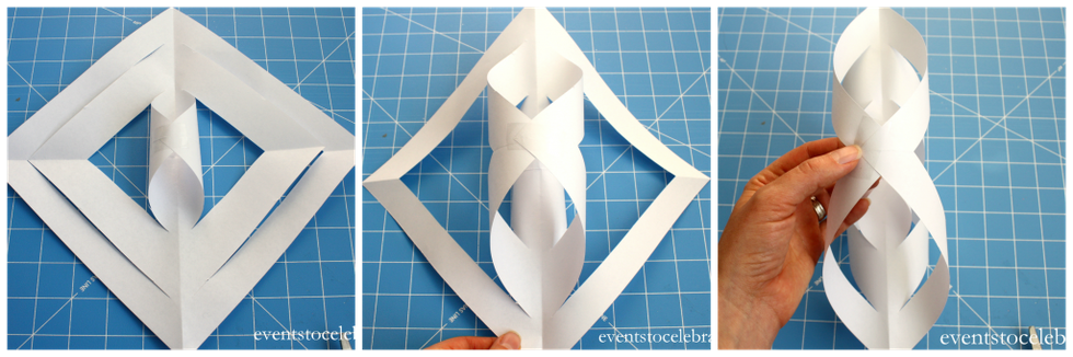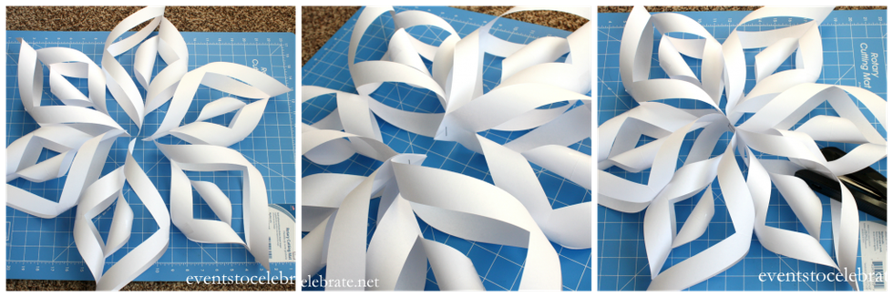 Lay your six pieces out into a snowflake pattern. Pinch three of the centers together and secure with a staple. Pinch the remaining three centers together and secure with a staple. Then take the two halves and staple them together. Last, add a staple to the connection point in between each section.