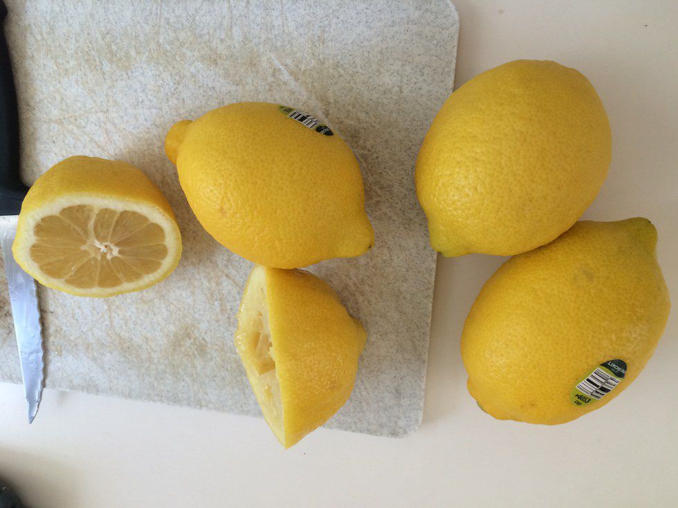 I got four lemons, to play it safe, because I didn't know how much lemon juice one would produce. Turns out I was able to squeeze exactly 1/4 of a cup of citrus from each lemon, and only used three lemons- although I ended up throwing out most of the unused juice later.