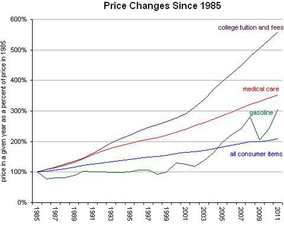 This article shows that in 2014, two years ago, text books prices were 812% higher than they were in 1978. Yes, 812%. Should I say it again? 812%. This cost is stacked on top of tuition which has risen 599% since 1985. If you don’t believe me, here is a graph from a journal titled "Economix"