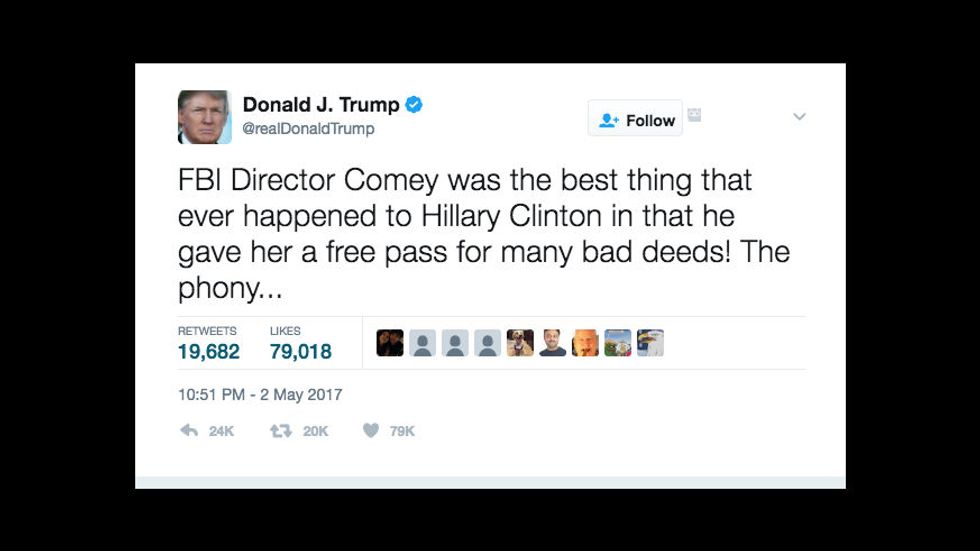 Even a couple weeks ago, Trump tweeted that Comey "was the best thing that ever happened to Hillary Clinton in that he gave her a free pass for many bad deeds!" Hmm... Were you not to receive the same treatment if Comey were to find out you did have contact with the Russians, Trump?