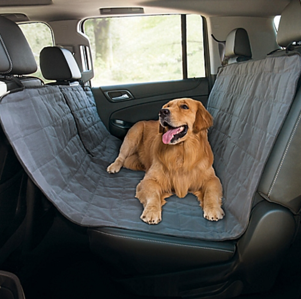 This "Pet Hammock" Car Seat Cover is probably the best pet invention since the Kong. Not only will it keep Fido comfy and secure in the car, but it will also protect your leather seats from scratches and excessive hair. Lots of places sell variations of this item, including Bed Bath & Beyond!