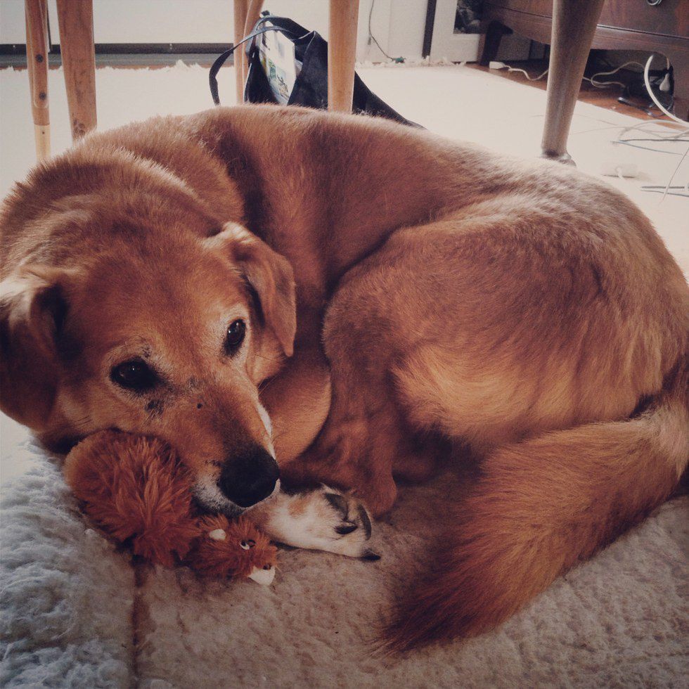 She was idiotic when she was younger, chasing deer with a vengeance and attempting (but always failing) to befriend the neighbor’s cats. As she’s aged, she’s become much lazier and contemplative. She searches out sunbeams in the house to nap in all day, sniffs every blade of grass on her walks, and looks at and ignores all wild animals that used to catch her attention. In her old age, she has become more affectionate, too.