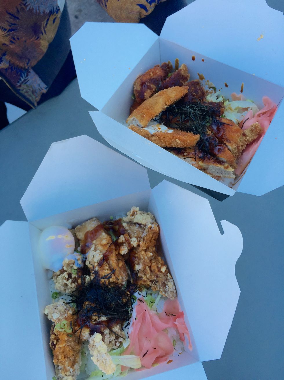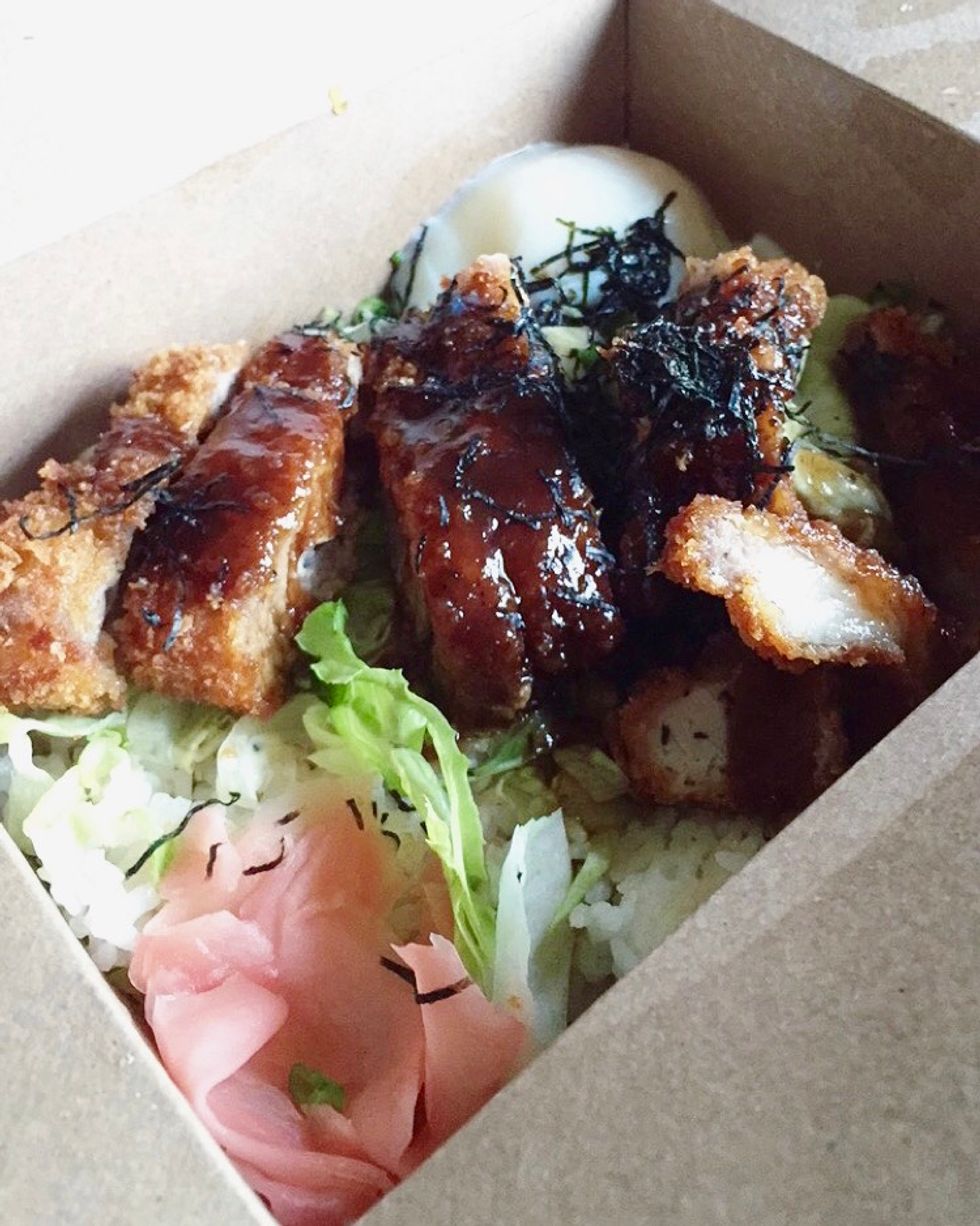 The food truck is open from 12 p.m. to 5 p.m. and there is a line even before opening. Each entree comes in a black to-go box with rice, ginger, cabbage, shredded seaweed and your choice between chicken ($5), chicken katsu ($5), beef ($7), veggie and tofu ($5), and pork belly ($9). The portions are extremely large and can keep an average person full for around six hours.