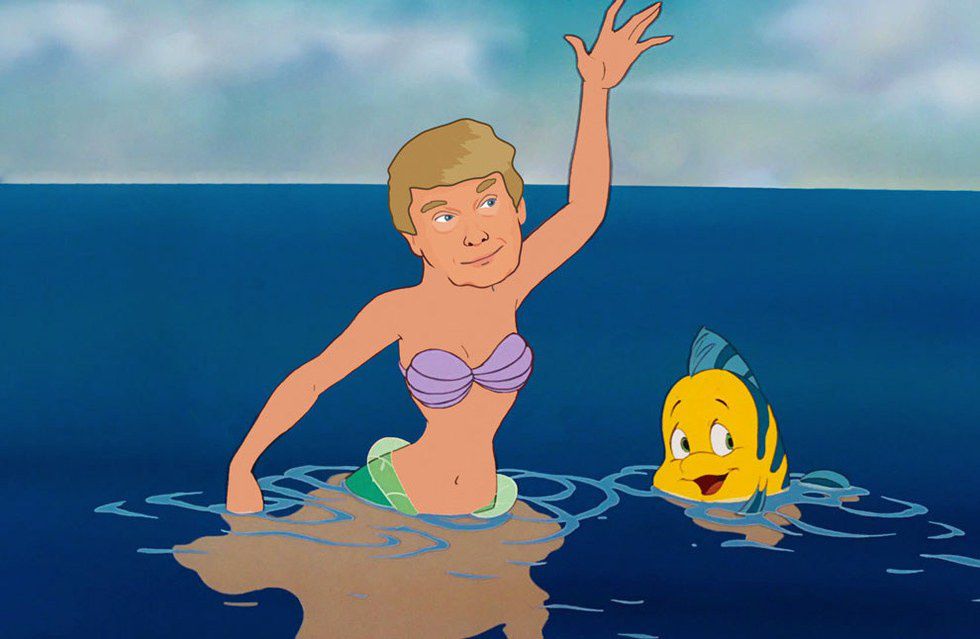 As floods increase, Donald Trump decides he'd rather be a mermaid than deal with the problems our planet is facing. He urges Ursula to change him into a mermaid in exchange for his voice, and he is so excited to begin his life under the sea. Unfortunately, he eventually realizes that life under the sea isn't all it's cracked up to be. His best friend Flounder accidentally eats plastic, choking on it, as Trump's other friends similarly continue to die from the pollution in our ocean. Unfortunately, two years after his transition, an oil is accidentally spilled into the ocean, and he dies.