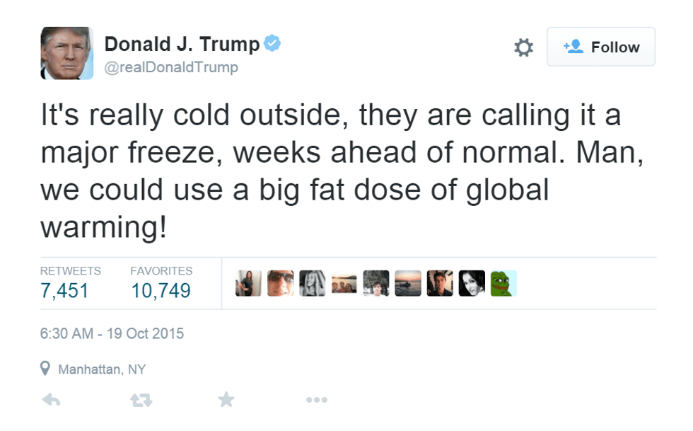 Not understanding climate change is one thing, but denying it and mocking it is another. Donald Trump -- or any politician, for that matter -- denying climate change on the basis that it snowed would be like jumping in the air to prove that gravity doesn't exist: It just doesn't work that way.