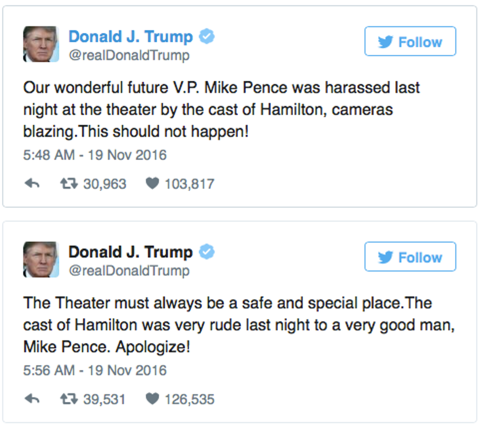 “Very rude and insulting of Hamilton cast member to treat our great future V.P. Mike Pence to a theater lecture. Couldn’t even memorize lines!” Trump wrote later in a tweet posted at 7:32 p.m. ET on Saturday night prior to deleting it.
