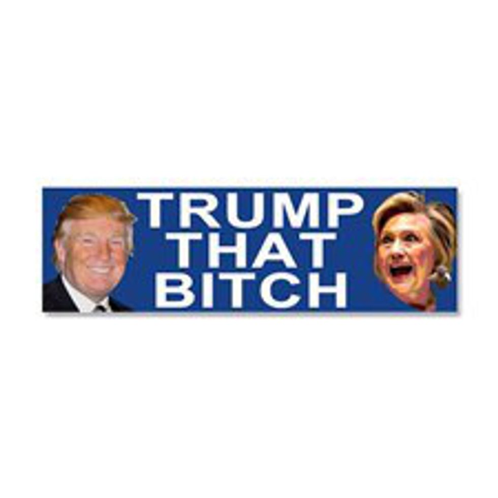 Trump also has some interesting campaign materials, and by interesting I mean vulgar and insulting. There is a car magnet with Trump’s face and Hillary’s face and in bold letters spell out, “Trump That Bitch”. The picture of Trump’s face is clear and him smiling while Hillary has a horrible blurry picture with her not looking as nice as Trump does. The profanity combined with the awful representation has Trump’s name written all over it, literally. This is an awful representation of the woman presidential candidate and how Trump thinks of her.