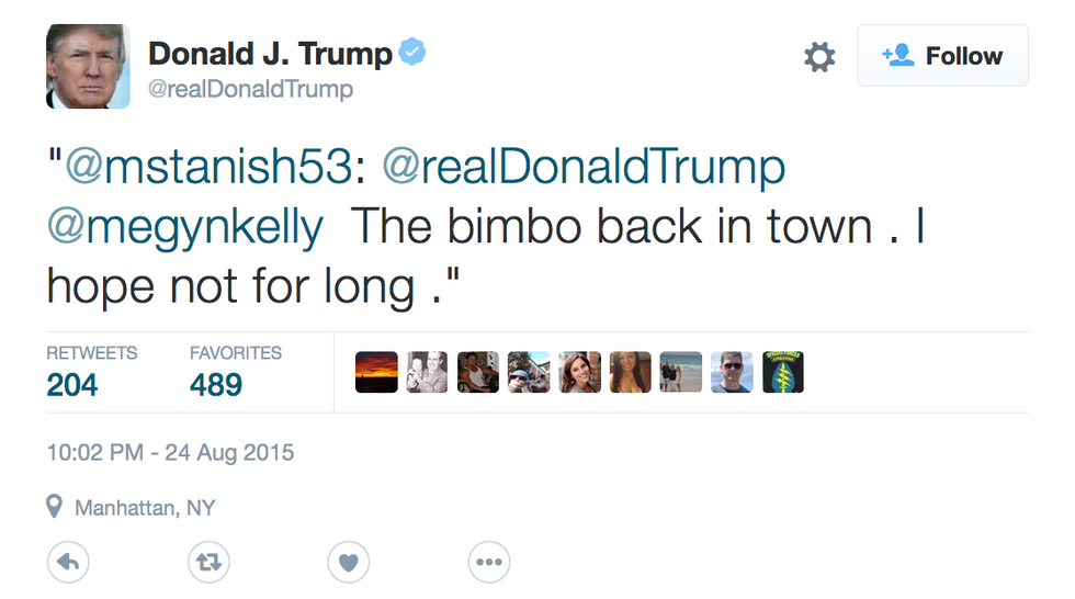 Someone needs to deactivate Trump’s Twitter account and educate him on how to properly treat and speak about women. There is no reason why he should even be considered to be our president if he is going to use vulgar language and attack women like this.