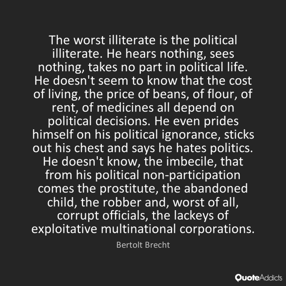 Political correctness often times refers to every social justice issue, including gay rights, women's rights, transgender people and racism. People who don't like to face the fact that their position and exploitation of their own privilege may contribute to any of those pressing issues is scary. They don't like blame and are the true people who are afraid of words. They kick transgender people out of the bathrooms they have been using for the past 40 years, that are theirs and that they pose no threat to and have the audacity to compare college campus safe spaces for students victimized by racial slurs while trying to get an education is just "whining." Donald Trump will not build a wall or deport anybody. Most of what he says he will do, he legally cannot do. Trump supporters call themselves the "silent majority." Another example of them being proud of ignorance, of silence. Why be the silent majority? Even if you support Trump, why be silent about it? Why wouldn't you want to openly support what you believe in? Because they are afraid of intellectual conversation and what they do not know.