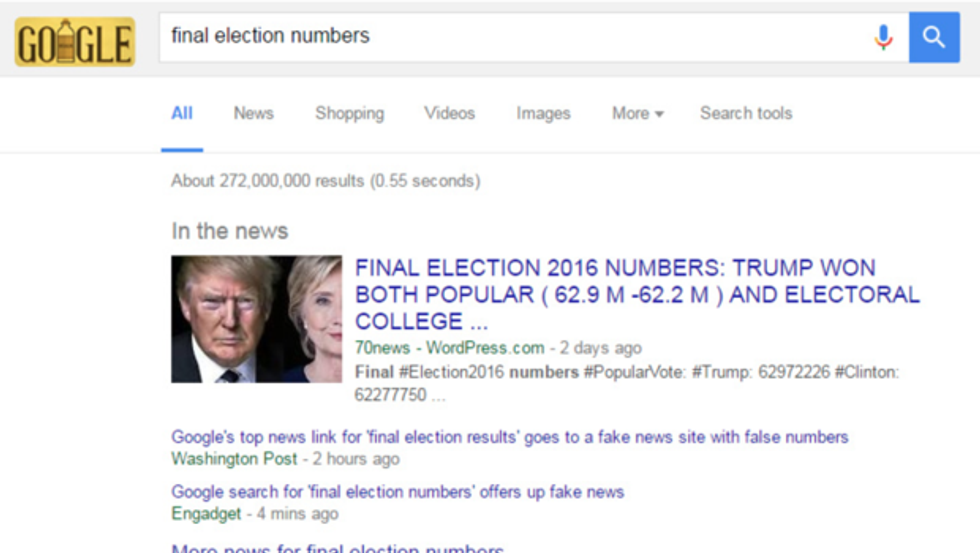 The story Trump's popular victory gained traction and soon it was shared far and wide. I originally thought this was just perpetuated by some Facebook user who happened to get the article to go viral, which might have helped, but in reality when you typed in "Final election numbers," Google had the Article from 70news on Wordpress as the top result. This is likely due to an algorithm in Google's system but is still not something Google should be proud of at all. More and more major news outlets began to report on the fake news problem both Google and Facebook were facing. Many started to blame them for perpetuating the uninformed opinions causing the election results. This opinion was not held by just general news outlets but by President Obama and, for lack of a better term, his adversary Edward Snowden. Both addressed the growing fake news situation. Obama said, “If we can’t discriminate between serious arguments and propaganda, then we have problems," and Snowden called it, "...a sad indictment of our democracy." The anger built insofar that people called out Facebook and Google of rigging the election. That seems to be pretty extreme, as Facebook has been recently criticized for censoring and withholding conservative news. The fact remains, things need to change.