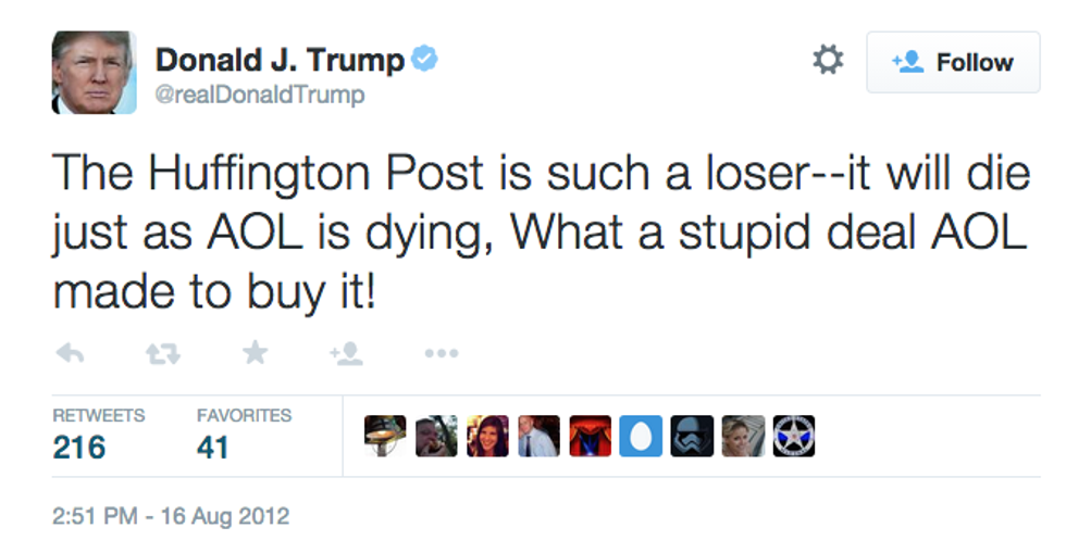 Most recently, the most hated billionaire was quoted calling Fox News critic Charles Krauthammer a loser. Krauthammer is an American Pulitzer Prize-winning syndicated columnist, author, political commentator, and a physician. In 2006, Krauthammer was named the most influential commentator in America by influencing U.S. foreign policy for more than two decades. What a loser. This of course is only the tip of the childish iceberg that is Trump's presence on the internet. Donald Trump is well-known for using Twitter has his personal rants. In August 2012, Donald Trump tweeted about The Huffington Post , calling them losers. In the same year, Donald Trump called Cher a "lonely loser" for attacking Mitt Romney.