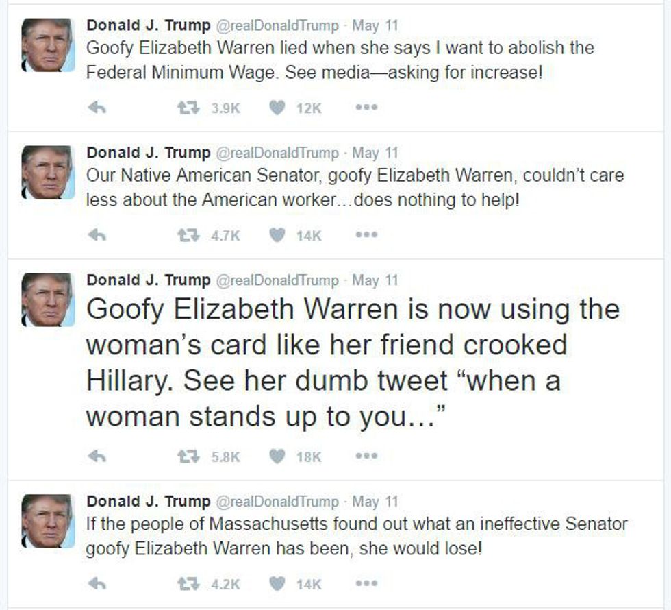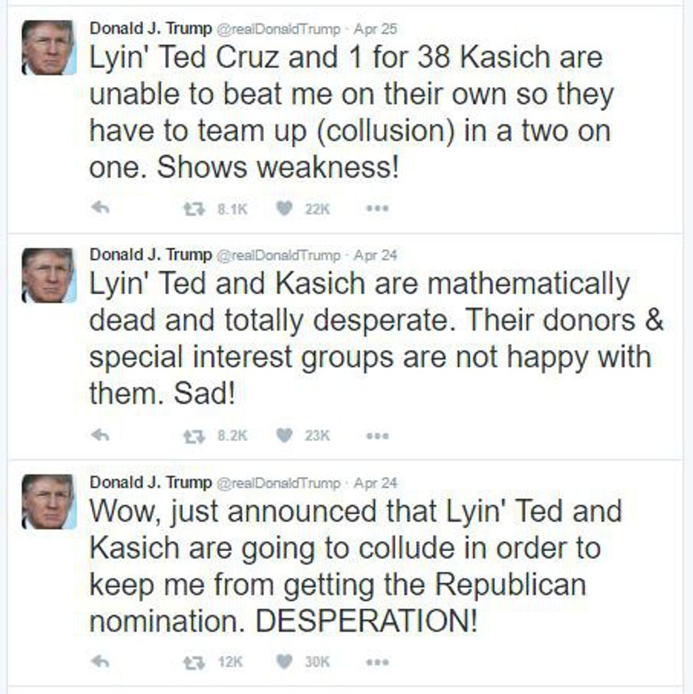 Trump is a politician, so of course he has opinions that conflict with other popular politicians. Totally normal. But what isn't normal is how he refers to these people in his Tweets. To emphasize, I guess, how he feels about these people, he has an adjective linked to their name that always appears when they are mentioned. For example: