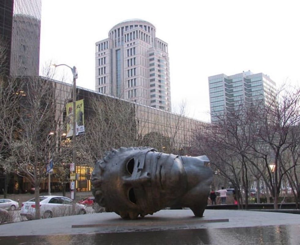 This head belongs to Eros, the Greek god of love and desire. This sculpture is suppose to represent opposing views of if civilization is broken beyond repair or if it's being held together despite the worlds destructive powers. You can climb inside the toppled head and peak out of the eyes for a good photo.
