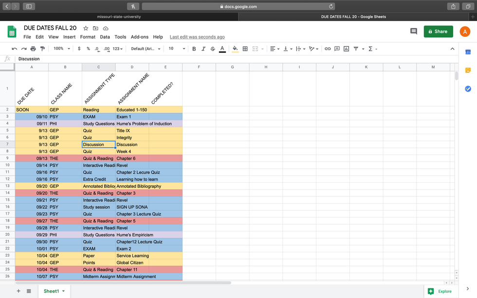 You'll then want to gather all your due dates from each classes' syllabus and add them to the calendar. Organize these by date first!