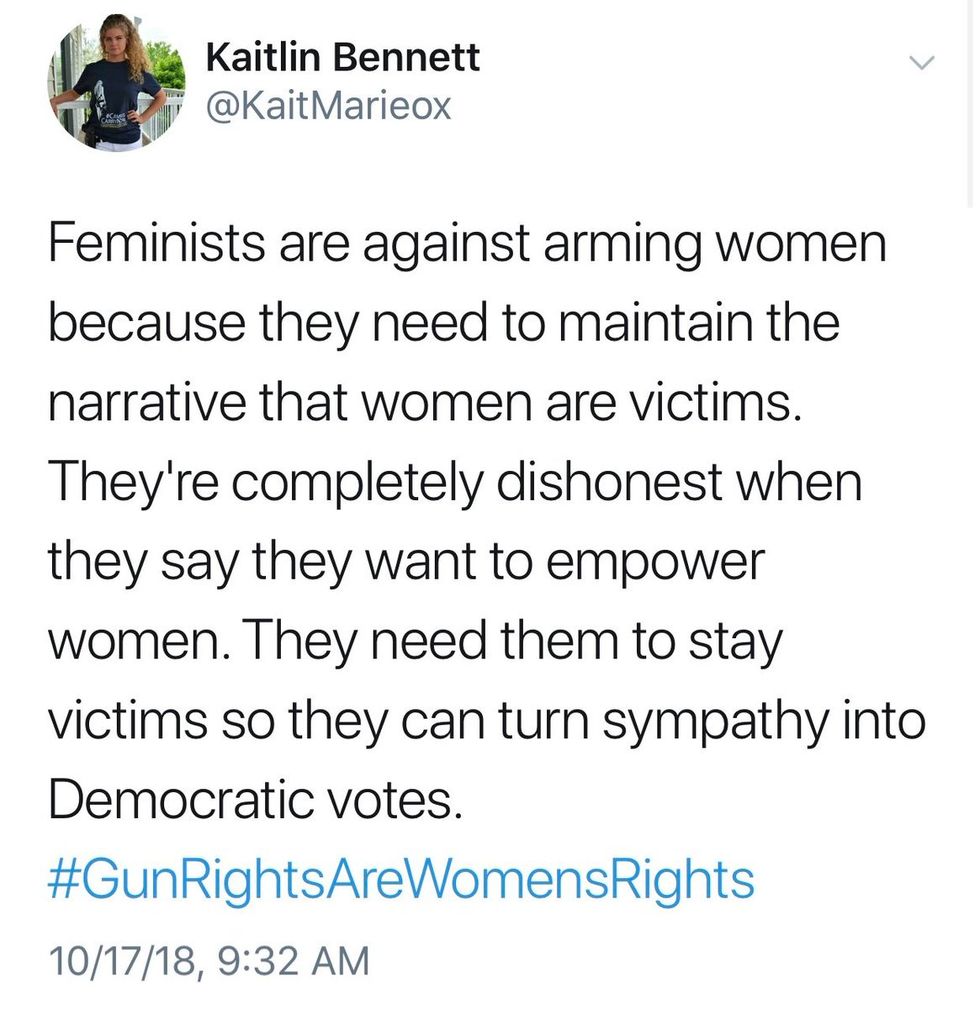 Feminism is technically defined as "A belief that men and women are inherent of equal worth." Yes, the initial concept of feminism was protesting for women's rights, how it was advocacy for the rights of women. So the idea of Kaitlin trying to incorporate 'women's rights' into gun rights is almost misleading? She says that feminists (which I'm assuming she's just pointing to females), are against arming women to maintain the idea that women are victims. She has it all wrong, and I just want people to be more educated on topics before they speak on them. So Kaitlin? Lock the phone, shut the computer, and continue on with your day.