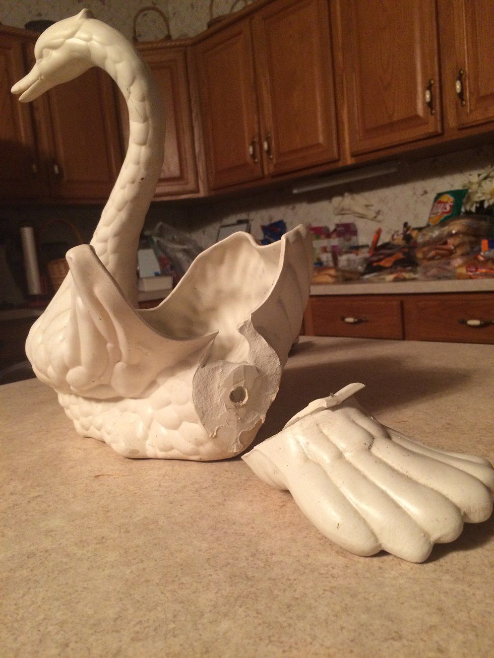 No, I’m not here for kid bashing, but let’s face it, all kids, even our own are terrors sometimes. I guess it’s a good thing that they are so dang cute! Anyways, after the cookout was over and there was just a few of us left, I’m sitting at my aunts kitchen table and all of a sudden my ears are filled with words and phrasing that are not suitable for my usual G/PG rated articles, but I will say that she was pretty pissed. I look up and see her holding a planter that holds one of her many house plants, shaped like a swan, broken. Because of the events of the day we knew it was the little girl that did it. The swan was turned to not show the broken side and the pieces were pushed off to the side.