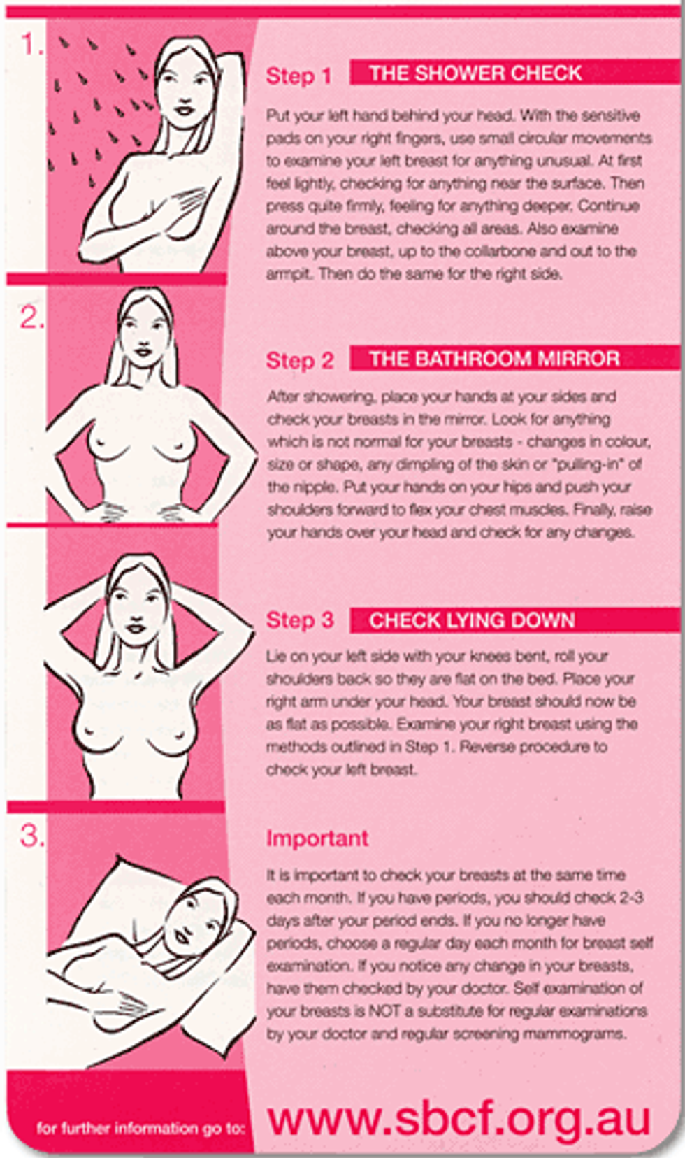 Here are some diagrams to show you some steps to self examining. Please take time to look at these to help you through this process. If you suspect something contact your doctor as soon as possible to get a check up. And don't fret, get your breasts checked! :)