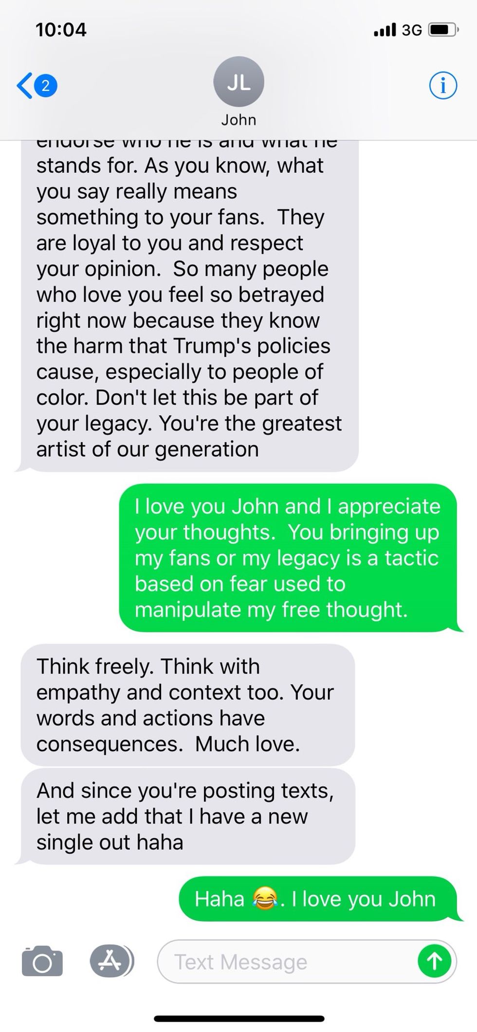 Unlike most celebrity tweets towards politics where the one side taken by the individual is clearly recognizable, Kanye bashes the idea of taking sides and refuting another person's differing opinions. This idea that people become so enraged nowadays when one person does not agree with another's views is not beneficial to the function of society in any way... and Kanye believes this. He wants everyone's opinions to matter and to not be judged. He shows this when he takes the time to screenshot text messaging conversations that he has with other individuals who may not see eye-to-eye with him. Kanye ends these conversations every time with love and positivity as a way to show that no matter the person's point of view, healthy relationships and a coming together can still be possible.