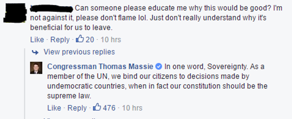 At first glance. This doesn’t seem so bad. Maybe it’s right that the United States shouldn’t have to listen to any other country in the world when we make our decisions. Doesn’t the United Nations violate our national sovereignty? Congressman Thomas Massie (R, KY) made that argument in his Facebook post promoting H.R. 1205, a bill he sponsored that would remove the US from the UN.