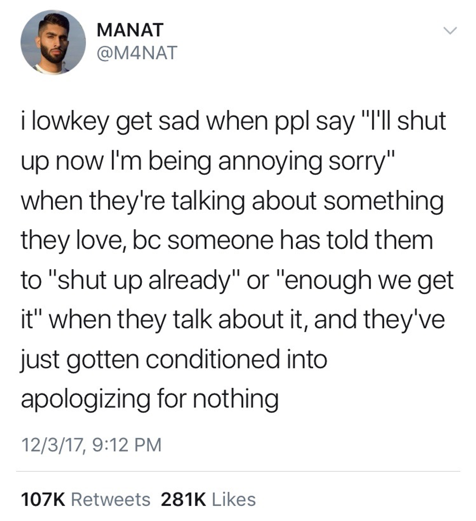 I don't know about you but there's something really special about seeing someone talk about something they love. Something else lights up that usually isn't there. If your friends aren’t happy about you finding a passion, drop them hard and drop them fast. Not to sound harsh or anything. Friends shouldn’t limit you to what you can talk about and they CERTAINLY should not make you feel so bad about doing and talking about something you love to the point where you stop doing it. No one should ever be “conditioned” into how or what they talk about. It’s just not humane nor fair.