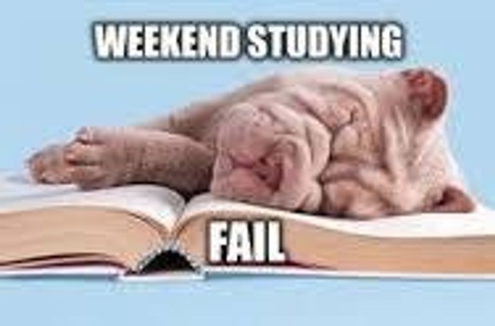 The weekend starts Friday around dinnertime and continues to Sunday afternoon. During this time period, you should not be in the Library or even reading your textbook in your bed for a quiz on Monday. There is a reason we do not go to class on the weekends, and there is the reason for the saying "TGIF." It is such a buzzkill when your friends are excitedly making plans for the weekend and you pipe in saying you think you are going to study all night in the library for your test next Wednesday... I am sorry, but no. You have plenty of time to study before then. No sense in wasting a great football weekend studying.