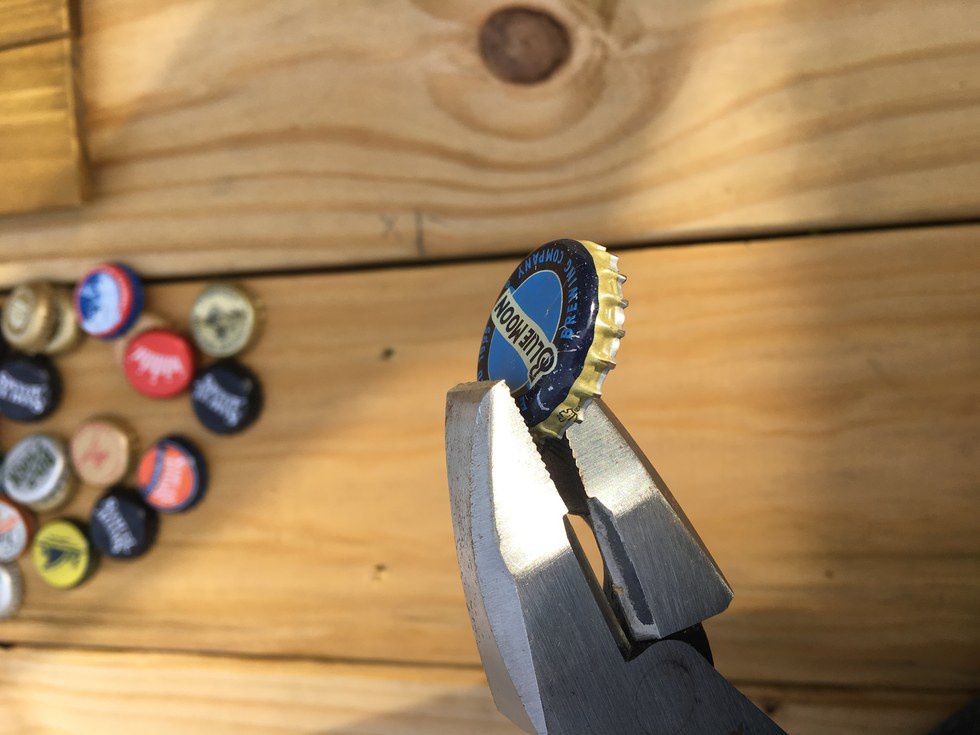 Using the pliers to guide the edges of the cap outward makes it easier to hammer and form a nice, flat, bottle cap.