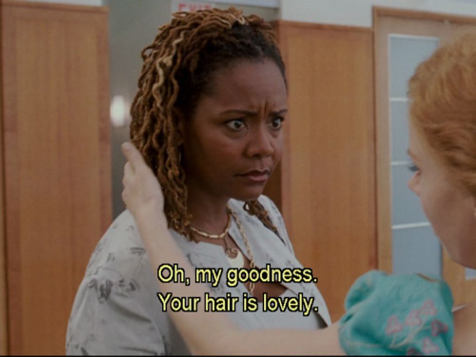 Around this time I was dancing in my own world and this man of color, do not know his ethnicity, pop my dancing bubble and compliments my hair. After a few exchange of words, he asked if he could touch it. Being buzzed and never experienced this first hand, I told myself why not and said sure. Let me tell you this was extremely awkward. It was similar to this,