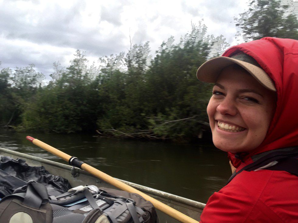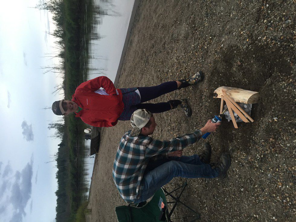 Pictured: Me, unashamedly bedecked in typical Alaskan attire while my friend lights our campfire with a blowtorch.
