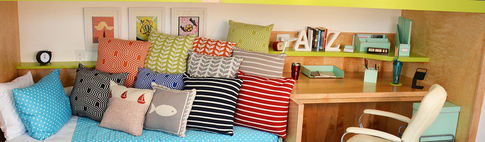 It's awkward when someone comes to stop by your dorm room and there is no place for them to sit. I mean, except for your desk chair, but that'd be kind of weird, right? You've only just met. So, seating for guests is ultra important. A comfy chair from home to stick in the corner is fabulous. Or an even cooler option is to push you and your roommate's dressers together and sew up a little cushion. BAM- A BENCH. I did this with my sophomore year roommate and it was a total hit. (This is the actual photo from my sophomore year room! Props to my awesome mom for sewing the cushion! It was also stuffed with memory foam because my mom is rad like that.)