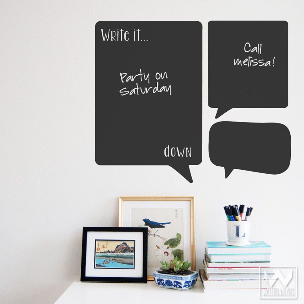 Vinyl wall decor is a God send. It applies easily and is removable without leaving behind stains or taking off paint. There are adorable quotes you can buy or geometric designs or metallic gold dots or ... just about anything you could think of probably comes in vinyl. I had a vinyl chalkboard I applied to my desk (recommended for all math majors!) and one for my closet where my roommate and I could write notes to each other and visitors could doodle.